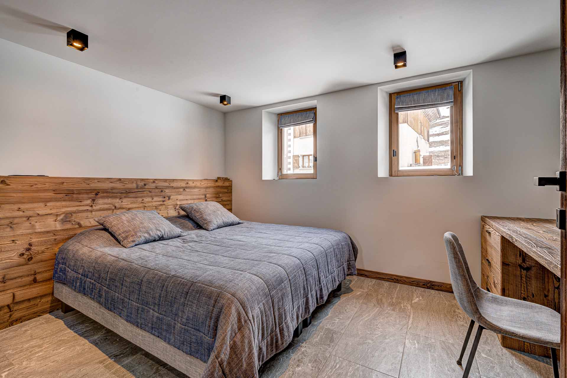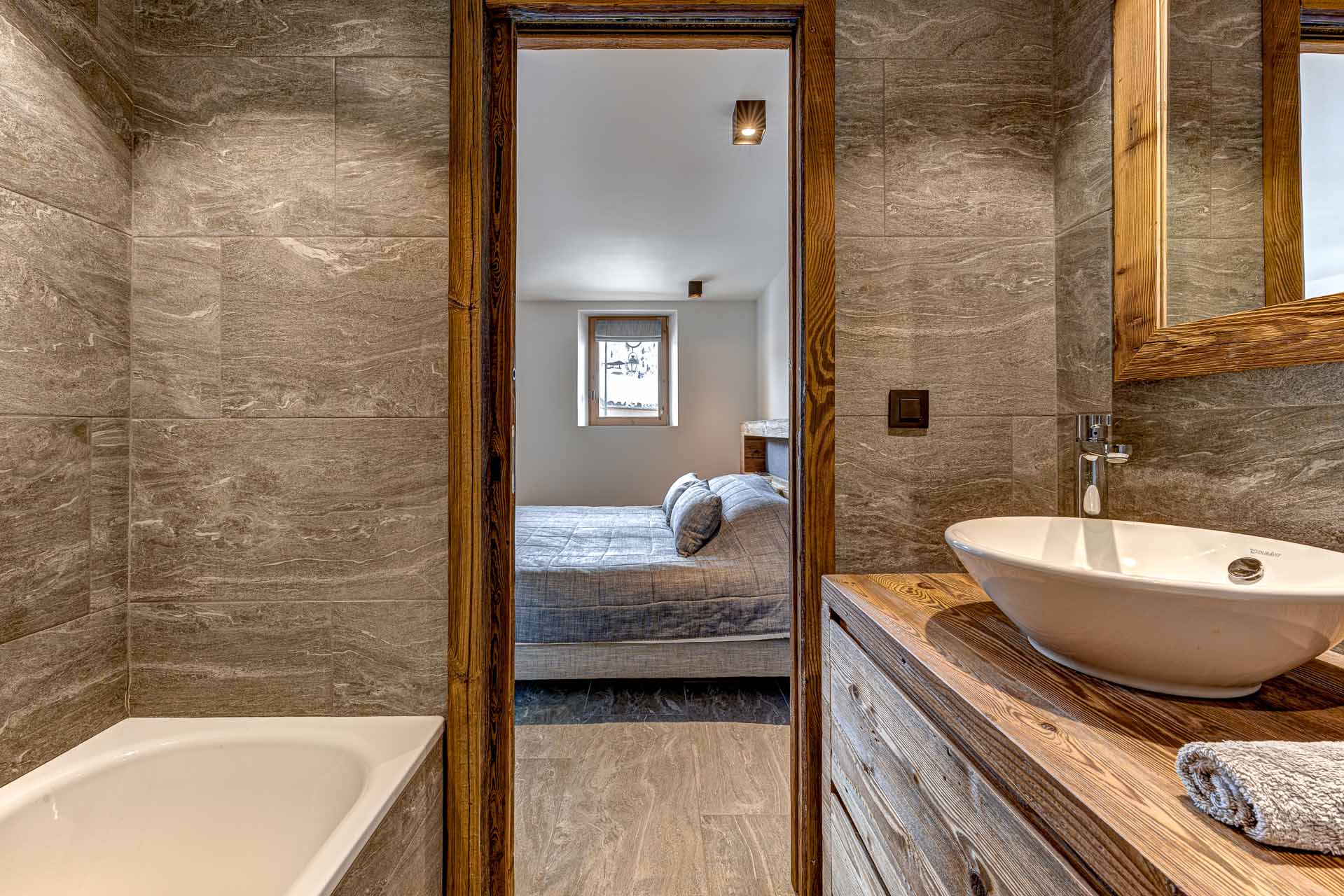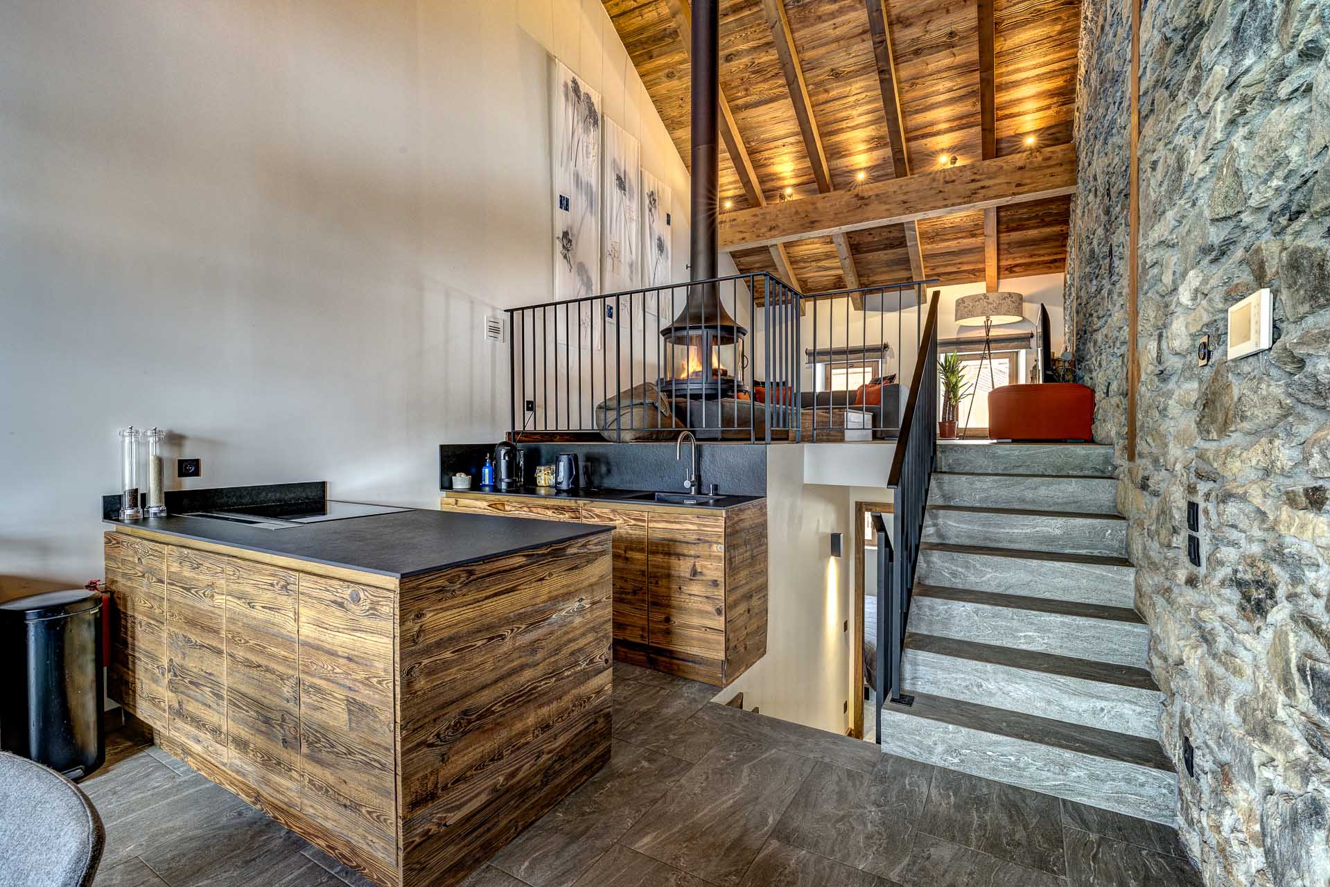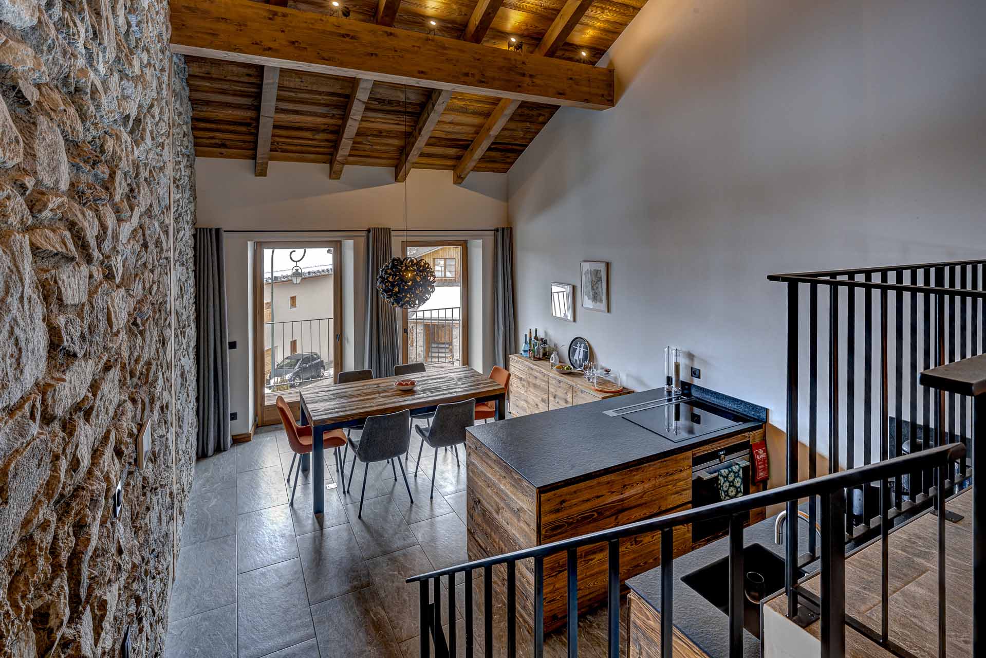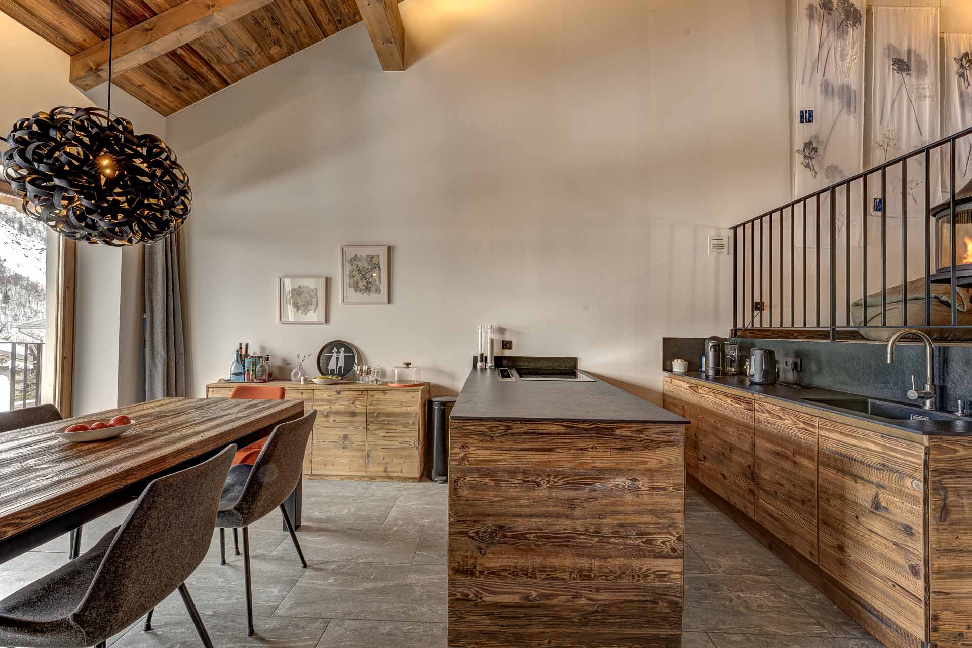 The top of the house has the stunning split level living area. On the lower level a beautiful Alpine kitchen and dining area opens onto a balcony with stunning south and westerly views over the village up towards Les Menuires and Val Thorens. Steps from the kitchen lead up to the living area, with a beautiful suspended fireplace and views to the rear. This whole level is full height with the most impressive feeling of space and light.
